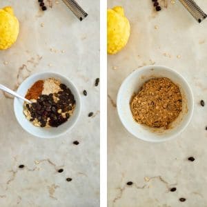 - Junta o restante dos ingredientes e mexe até estar tudo bem incorporado. Se achares a massa muito mole junta um pouco mais de flocos de aveia. Como as proteínas e as farinhas têm comportamentos diferentes de marca para marca é possível que a consistência fique diferente.