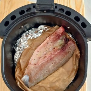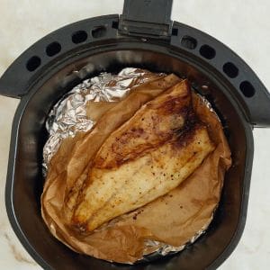 Como não gosto de lavar a Airfryer costumo forrar o fundo com folha de alumínio. Mas o peixe pega a pele ao alumínio, por isso eu coloquei-o em cima de uma folha de papel vegetal. Assim consegues tirá-lo sem partir. Desliza para o prato na perfeição. 😁