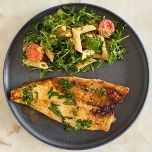 Coloca o filete num prato e rega com o molho. Eu servi acompanhado com uma salada de Massa Penne com Rúcula.