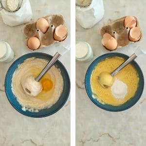 - Adiciona os ovos e volta a triturar com varinha mágica. Com a ajuda de um coador peneira o amido de milho e junta á mistura do queijo e volta a triturar.