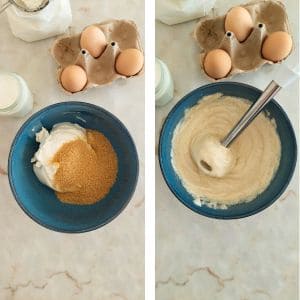- Numa taça junta o queijo creme e o açúcar e tritura com a varinha mágica.